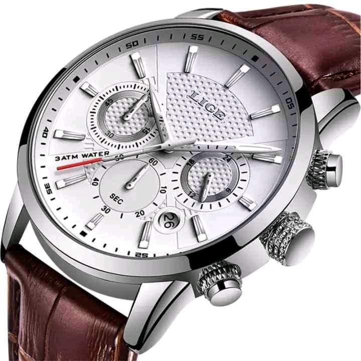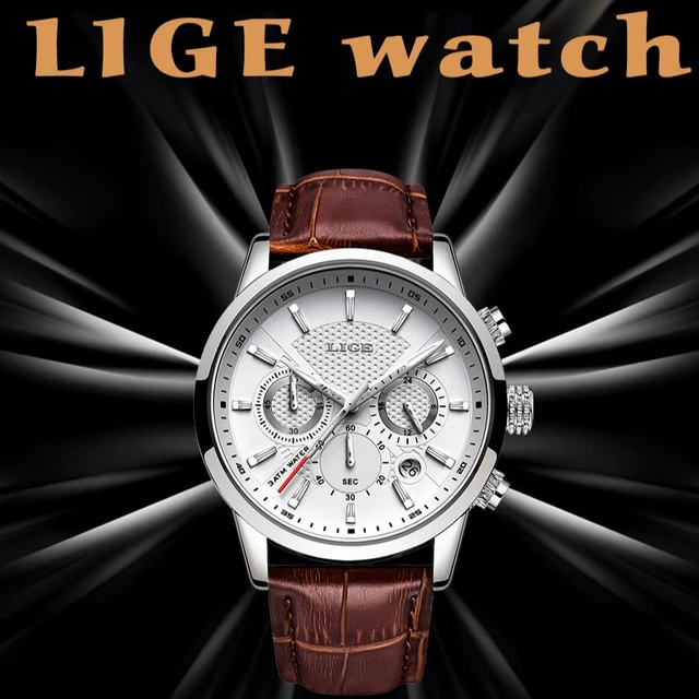 LIGE Men Fashion Sport Quartz Luxury Leather Waterproof Chronograph Watch 35